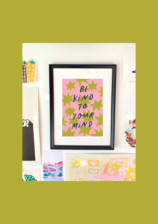 Be Kind To Your Mind Positive Quote Art Print | Positivity Wellbeing Wall Decor Quirky Slogan Bold Stars