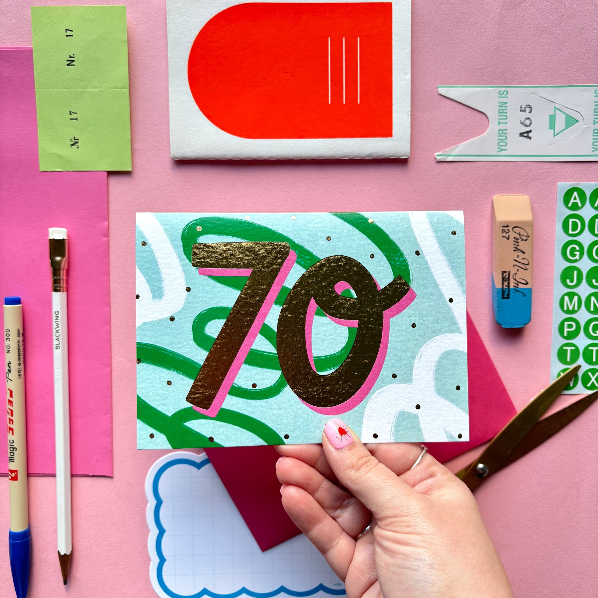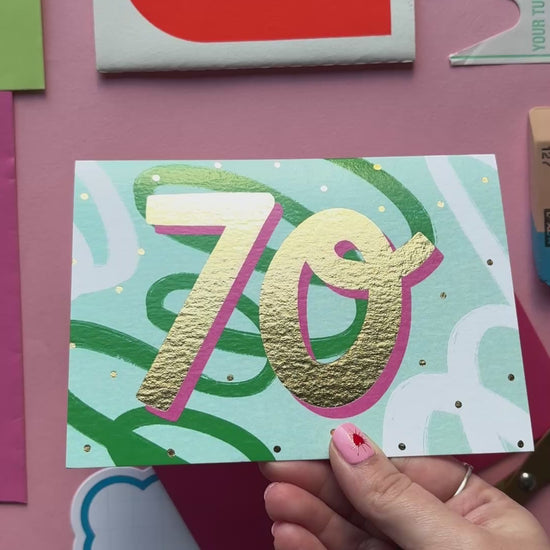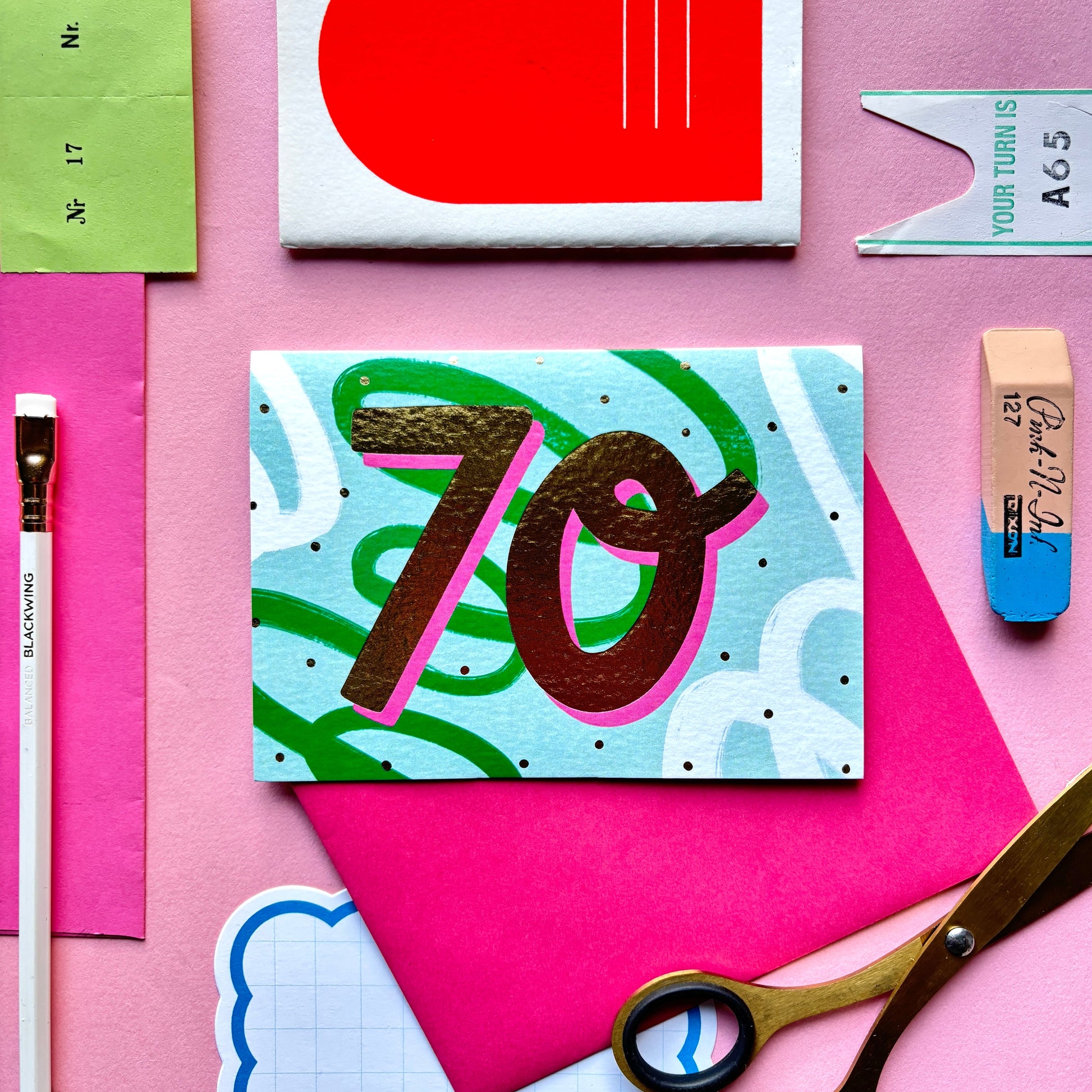 Celebrate someone’s 70th milestone birthday with this bright and colourful birthday card featuring textures with beautiful gold foiled details