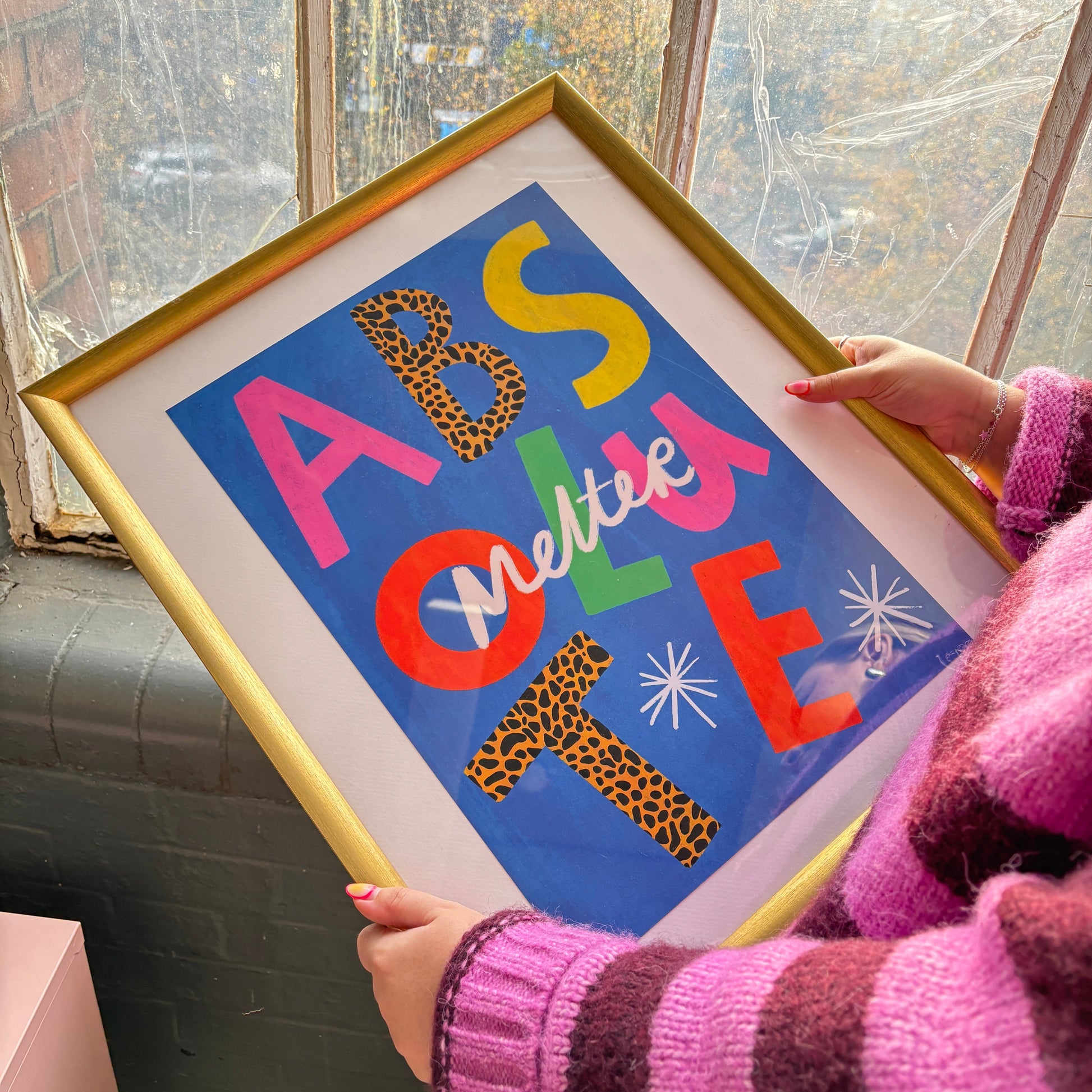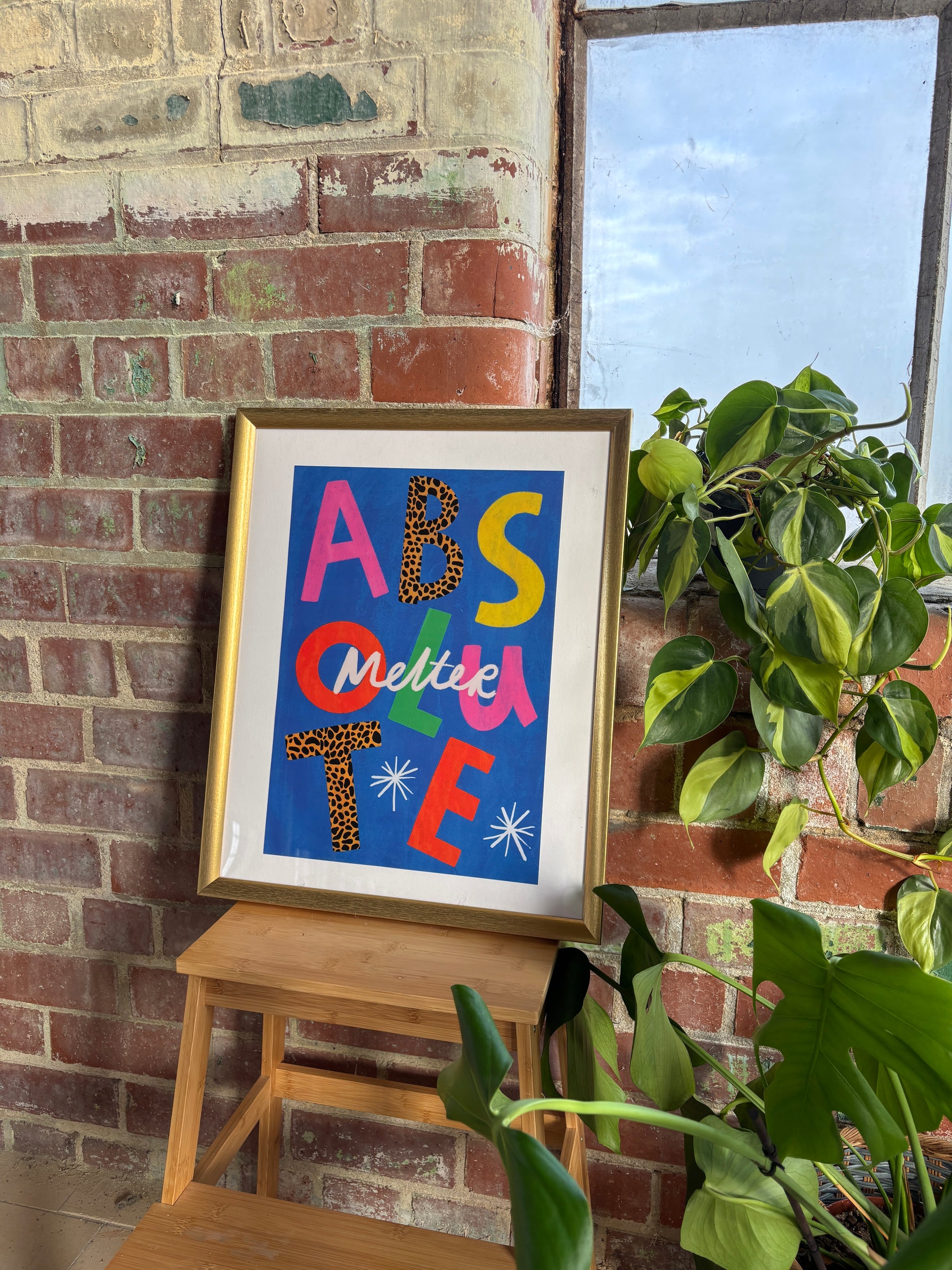 This bold and colourful art print makes a statement with the word "Absolute" prominently displayed in an eclectic mix of styles with the smaller word "Melter in the centre". Each letter is uniquely styled: some are filled with vibrant, solid colours, while others feature eye-catching patterns, such as cheetah print, adding a playful and trendy touch. The background is a rich blue, making the letters pop, and small starburst accents give it a fun, dynamic feel. This piece brings energy and personality to any room, making it a fantastic focal point for a home with a sense of Belfast humour and style.