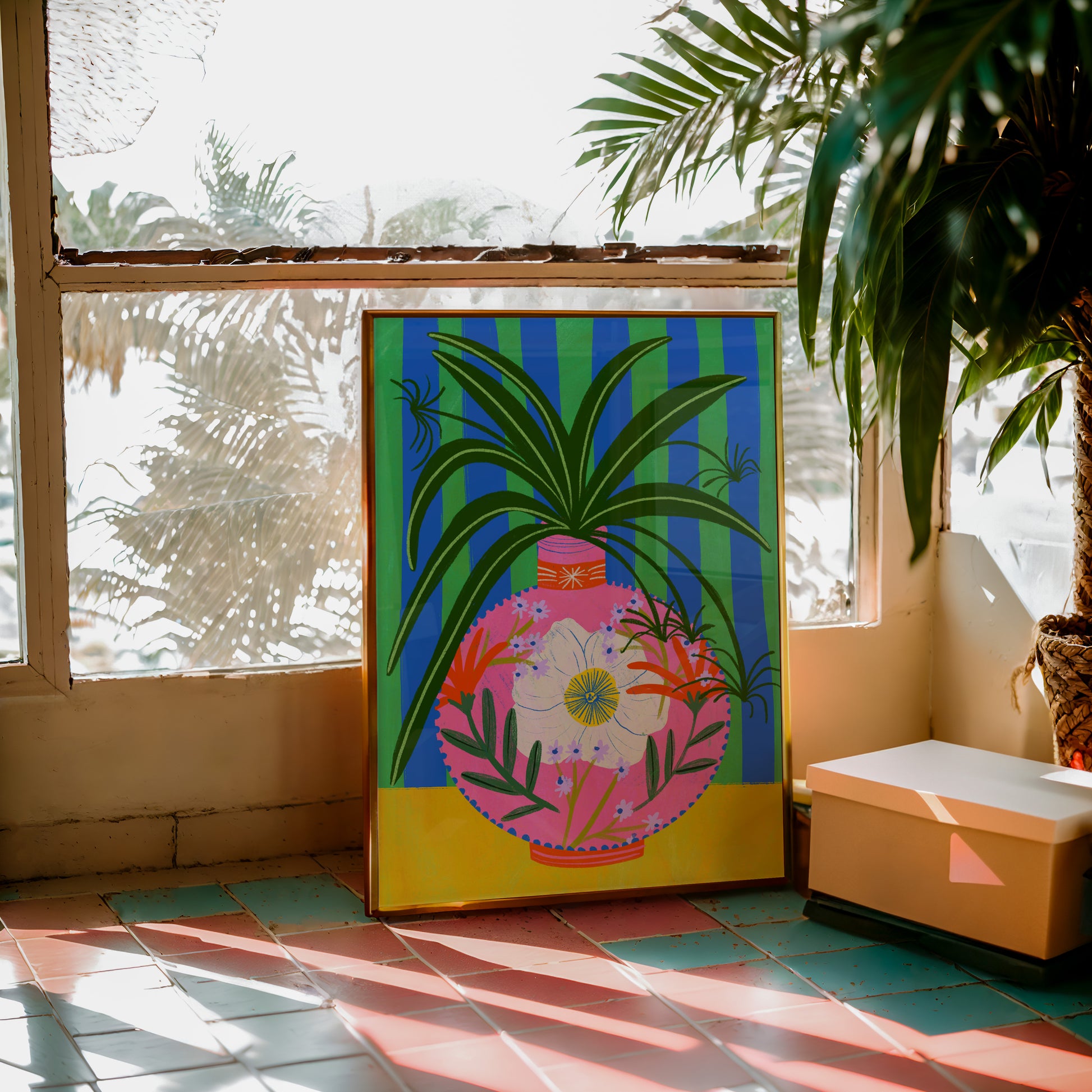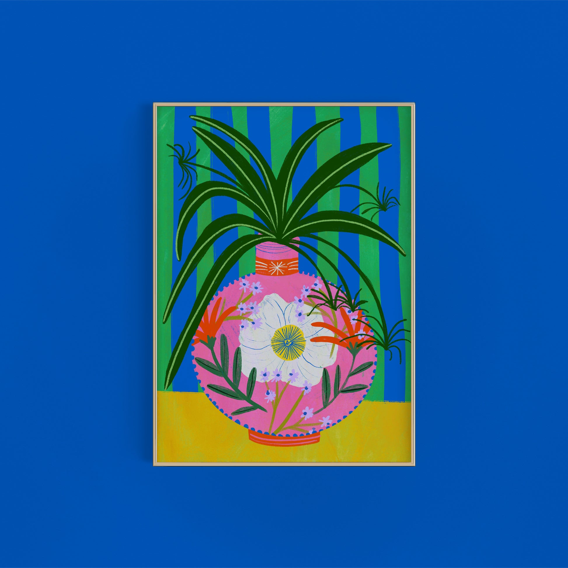 This vibrant art print features a stunning a beautiful spider plant in a delicate, floral vintage vase. The vase, adorned with intricate, classic patterns, contrasts beautifully with the modern, graphic style of the stripes behind it, adding a timeless touch paired with a contrasting and fun colour palette!