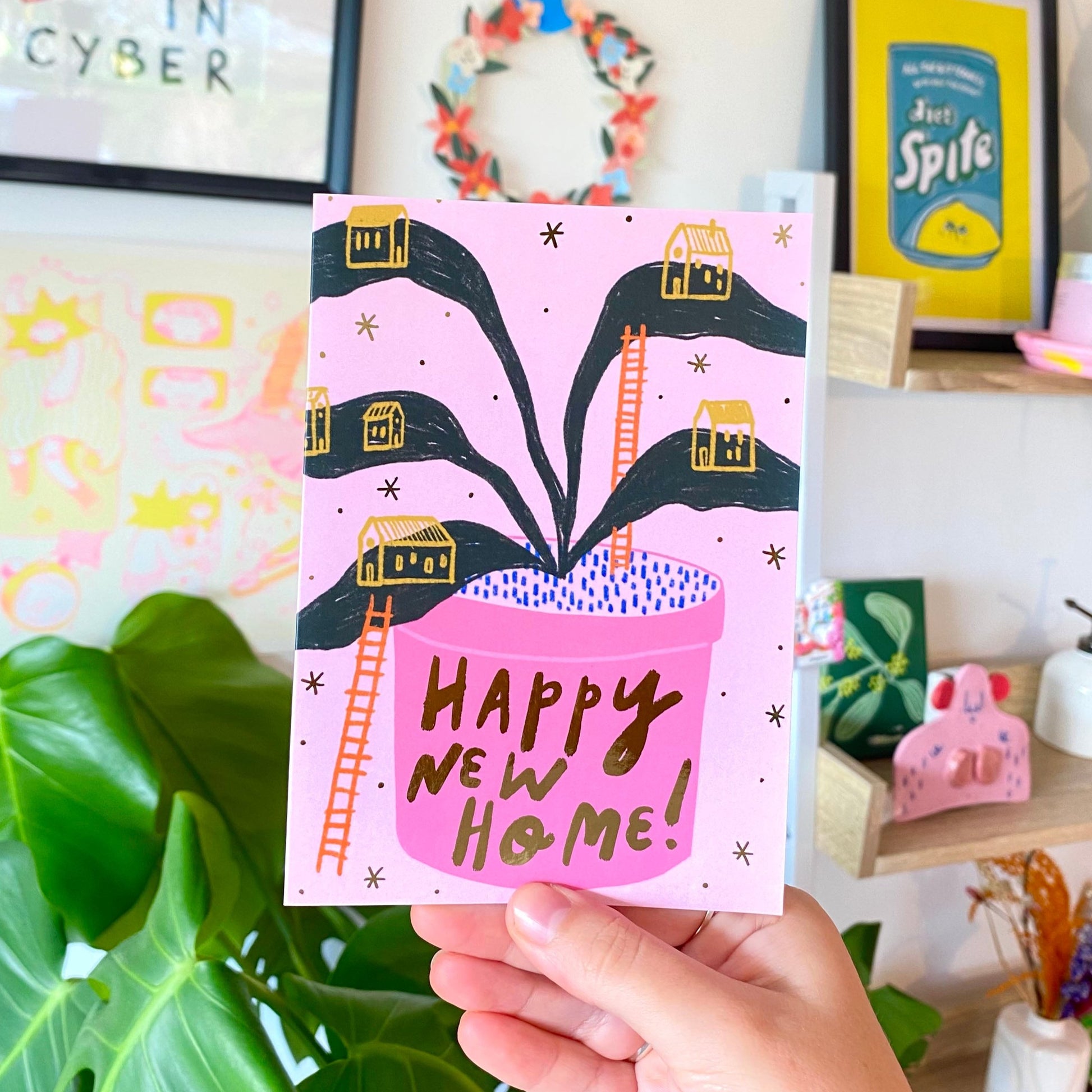 Happy New Home Gold Foil Greetings Card | House Plant Pink Bold Ladder Apartment Homeowner Flat Celebrate