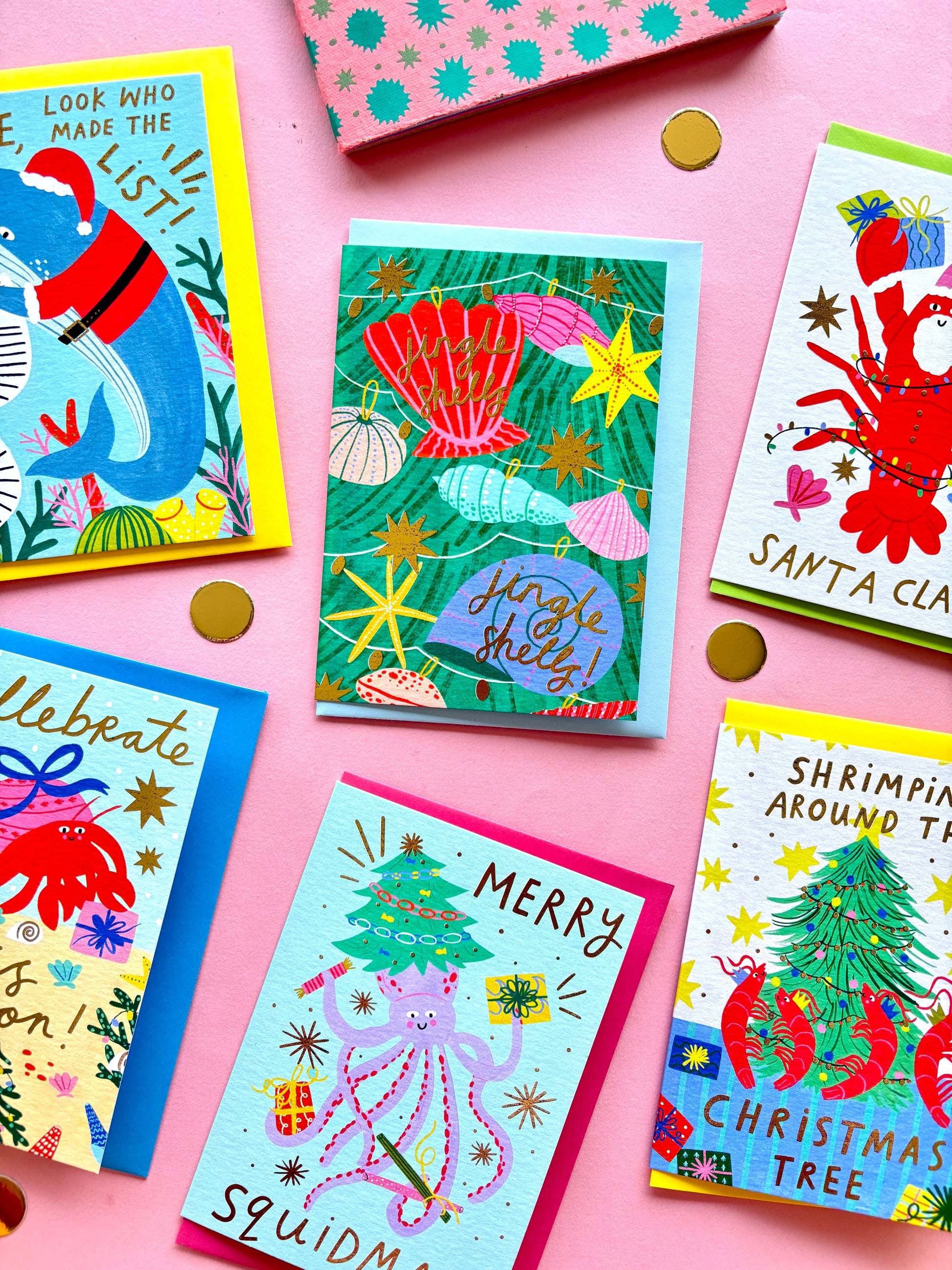 Featuring a cheerful squid wearing a decorated Christmas tree as a hat, juggling festive gifts, crackers, and sparkly joy in all its tentacles, this card is a must-have for ocean lovers and anyone with a quirky sense of humour. Bright, bold, and full of fun, it’s the perfect way to send seaside vibes this holiday season.