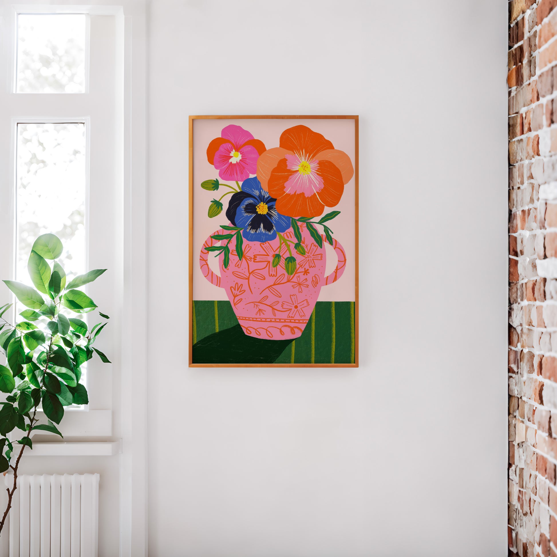 Pretty pink pansies in an antique vase - the perfect way to add a touch of class and sass to your walls. This print is the perfect way to add a pop of colour to your space and a fresh, spring burst of energy to your walls. Northern Irish designer Kerrie Illustrates takes inspiration from vintage and antique vases and patterns to create these beautiful prints with as personality as she has !