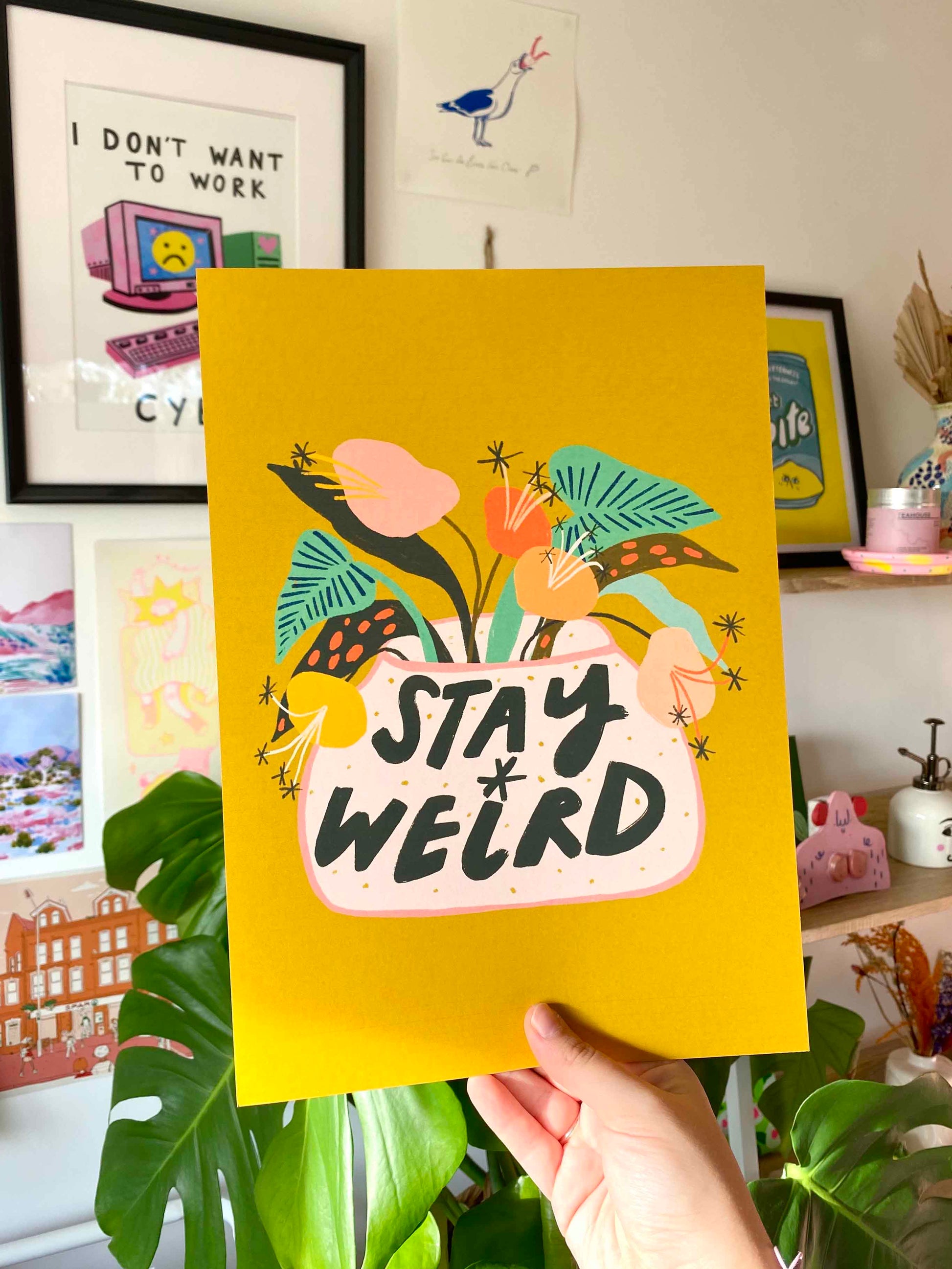 Add some personality to your walls with a pop of colour from Northern Ireland's Kerrie Illustrates, featuring bold black text, house plant illustrations and a warm yellow background. This Stay Weird art print is a vibrant, feel-good reminder to embrace your quirks, celebrate individuality, and live life unapologetically. Bursting with bold colours and maximalist energy, it’s the perfect piece for anyone who dances to their own beat (and maybe wears mismatched socks on purpose).